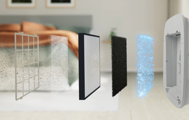 Pięciostopniowy system oczyszczania powietrza umożliwia usuwanie nawet 99,97% cząsteczek o rozmiarze 0,3 mikrometra (μm)