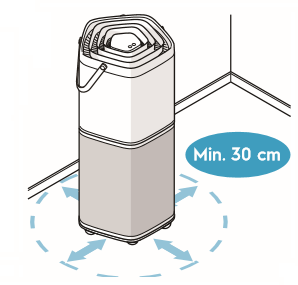 - Wokół urządzenia powinno być co najmniej 30 cm wolnej przestrzeni, jak na poniższym rysunku.