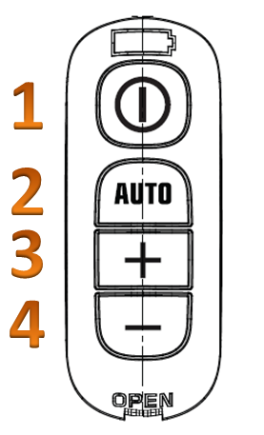 W pilocie bez przycisku AUTO, cyfra (2) nie będzie występować, przyciski + oraz - będą numerowane identycznie jak w pilocie z przyciskiem AUTO, odpowiednio (3) oraz (4).