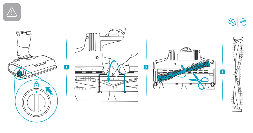 - Szczotka obrotowa wyłączyła się podczas użytkowania, ale jednostka główna nadal działa, na wyświetlaczu świeci się ikona „trójkąt/ostrzeżenie”