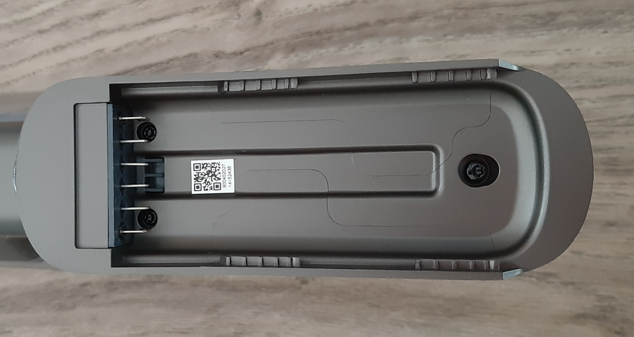 Pierwsze miejsce, gdzie możesz odnaleźć te informacje, to tabliczka znamionowa umieszczona pod baterią. Tabliczka ta jest widoczna po jej wymontowaniu na części ręcznej odkurzacza. Na tabliczce znajduje się naklejka z kodem QR, numerem PNC oraz numerem seryjnym, które są kluczowe dla funkcjonalności urządzenia.