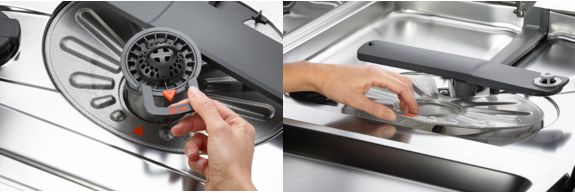 2. Wyczyść filtry zmywarki (również duży filtr wokół filtra pośrodku) i upewnij się, że na dnie tacy lub wokół niej nie ma resztek jedzenia ani zanieczyszczeń.