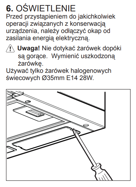 W instrukcji obsługi Twojego okapu znajdziesz także informację, czy żarówkę w konkretnym modelu możesz wymienić samodzielnie, czy tylko zlecić to wykwalifikowanemu serwisantowi.