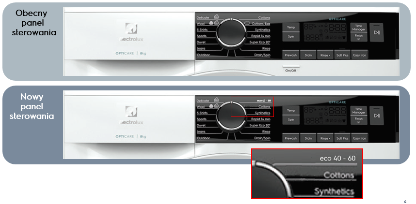 - Jedyna zmiana na panelu sterowania dotyczy dodania obowiązkowego programu "eco 40-60". Zastępuje on bieżący program "Bawełna Eco" już dostępny w urządzeniu. Jedyna zmianą dla klienta będzie zastąpienie jednego programu ekologicznego innym.