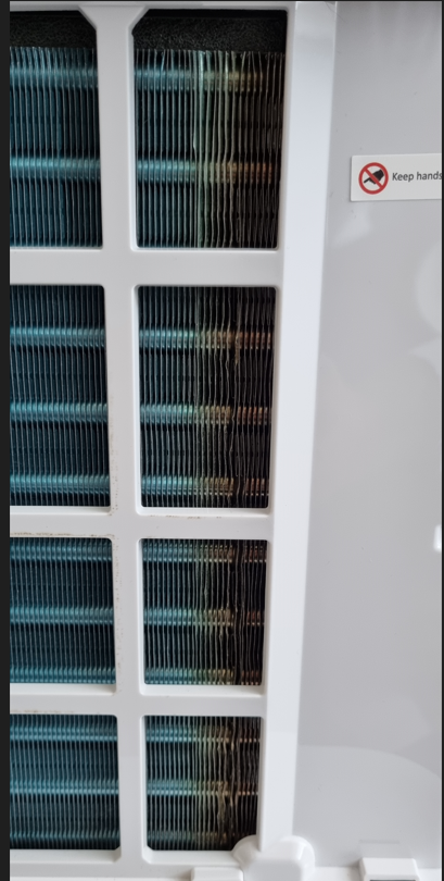 Po zdjęciu filtra użytkownik może zyskać bezpośredni dostęp do wymiennika ciepła klimatyzatora. Jedna strona wymiennika ciepła może wyglądać jakby była odbarwiona/skorodowana/zaśniedziała. Nie świadczy to o awarii urządzeniajest to prawidłowy wygląd tego elementu.