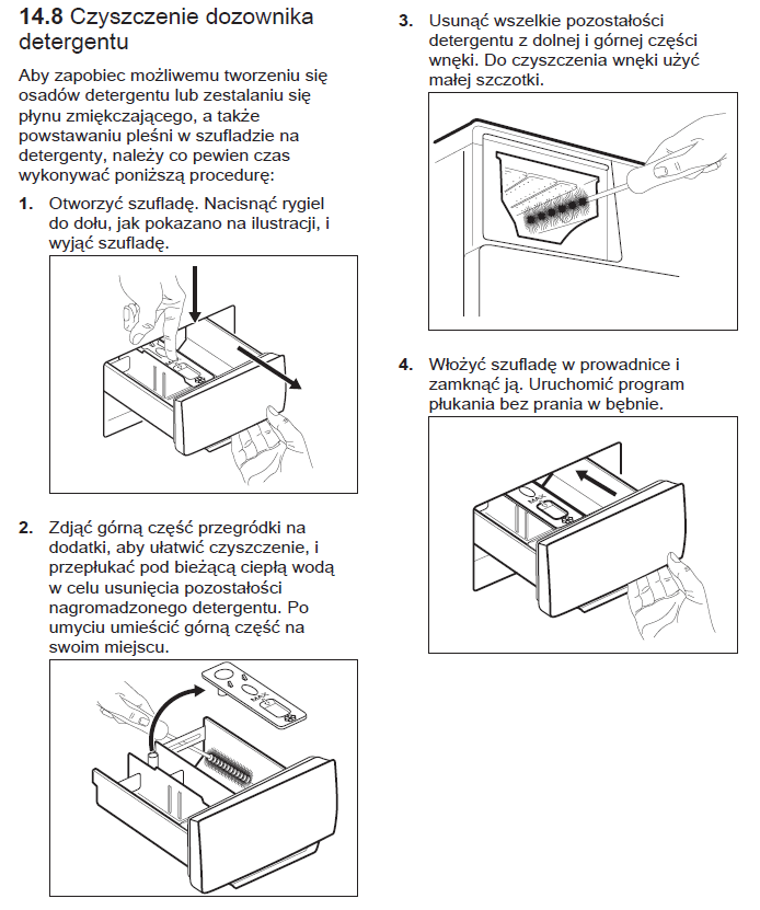 3. Przeprowadzić dokładne czyszczenie dozownika detergentów zgodnie z instrukcją obsługi dla danego typu pralki: