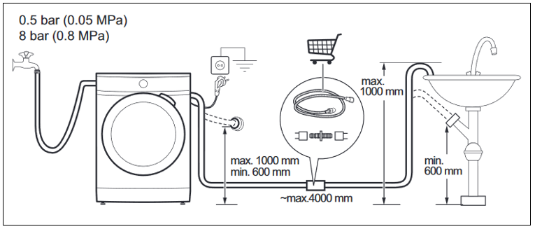 - Wysokość odpływu nie może być większa od 100 cm ani mniejsza od 60 cm, licząc od podstawy pralki lub jak pokazano w instrukcji obsługi.