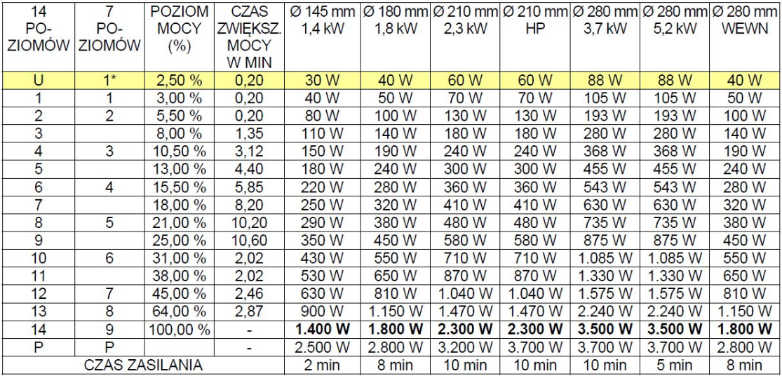 Poniższa tabela pokazuje, jak zmienia się moc pola indukcyjnego w zależności od średnicy pola i ustawionej mocy grzania. Tabela ta może pomóc w obliczeniach zużycia energii, co z kolei pomoże w oszacowaniu rocznych kosztów związanych z użytkowaniem płyty indukcyjnej.