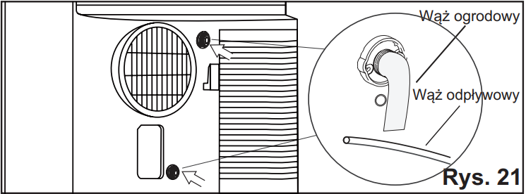 - Podłącz wąż odpływowy (dołączony do urządzenia) lub wąż ogrodowy (sprzedawany oddzielnie) do otworu odpływowego, a następnie poprowadź wąż do odpływu, który znajduje się poniżej urządzenia (rys. 21).
