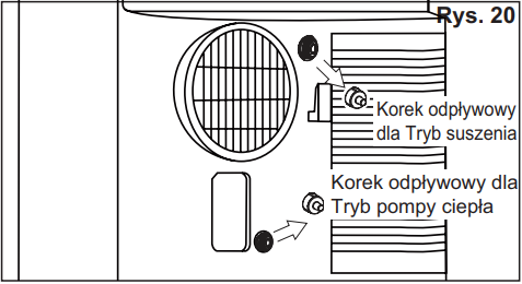 W trybie suszenia niezbędne jest podłączenie klimatyzatora powietrza do odpływu ciągłego skroplin. Oznacza to, że podczas pracy urządzenia musi być podłączony na stałe wąż odprowadzający wodę.