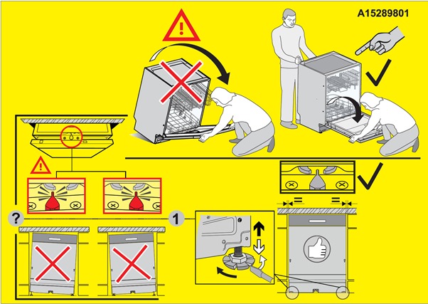 - Niewypoziomowana zmywarka (diament pozostaje w kolizji z bocznymi zatrzaskami zamka)